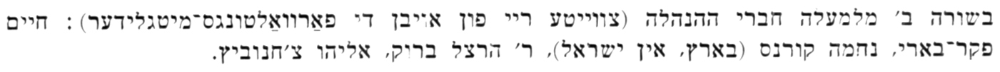 | Plate 4.3d: Second row from top – board members: Khayim Peker Be'eri, Nekhama Kornas (in Israel), R' Hertzel Brook, Eliyahu Chekhanovitz [H+Y] |